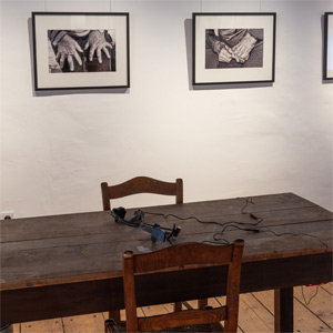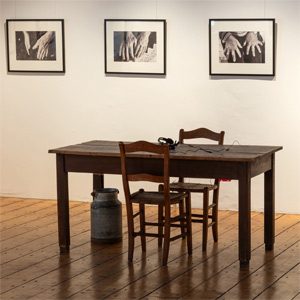 Installation: historischer Tisch mit Audiostationen, Fotos